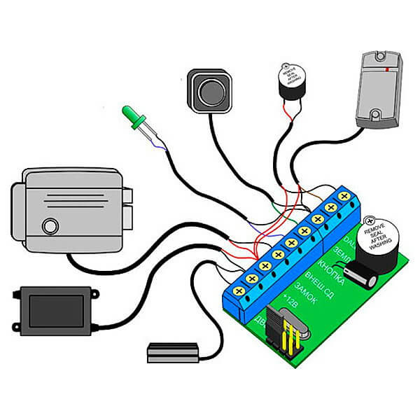 Позволява свързване на четец, бутон за отваряне, сензор за врата, електромагнитна или електромеханична брава, външен LED индикатор и външен зумер.